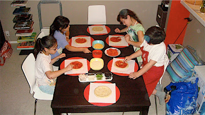 We taught them the 1st step – “Wash Your Hands”, and after the 2nd step – “Preparation”, we got all the ingredients on the table to begin step 3 – “Execution”. They mostly stuck to cheese pizzas with pepperoni, but Jordan and Kendall surprised us by being adventurous and trying a touch of garlic on their pizzas, with a little bit of Auntie Carrie’s Green Peppers.