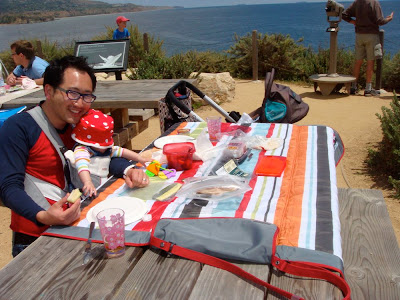 First things first: lunchtime! We brought all sorts of tasty stuff to eat out there. We found an amazing picnic spot overlooking the ocean. Seriously, the lunchtime view could not have been better.