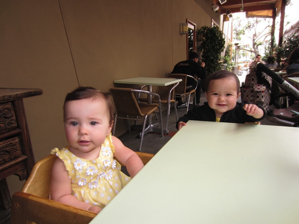 Ruby had her first lunch date today at Tender Greens in Culver City with her fabulous friend Olive. Olive was kind enough to share an order of organic sweet potatoes with apple and Ruby treated Olive to a veggie flavored Mum Mum. They were a real hit and attracted lots of attention – two women even walked past our table and thought they were twins!