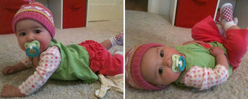 *She is scooting. And even crawling, kinda. Anything set just outside of reach can be motivation to get moving. All I have to do is set a piece of junk mail on the floor, and she can scoot/crawl right over to get it almost immediately. Curiosity is definitely the name of the game!