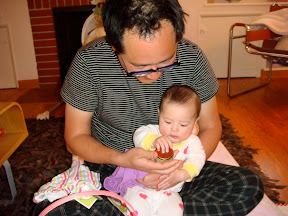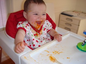 *She feeds herself (sometimes). Our girl definitely prefers the finger foods over purees, so we have been experimenting with baby- led weaning which, in a nutshell, encourages a baby to feed themselves small bits of solid food themselves. We cut up pieces of banana or potato, quarter up grapes, give chunks of avocado and let her snack on her favorite – Cheerios. As she develops (and we get braver), we work up to things like cooked pasta, small bites of soft cooked vegetables and more. She still loves her sweet potatoes and carrots in a jar, but she is really digging on things off our plates. We’re excited about building up a diverse and healthy palate for her!