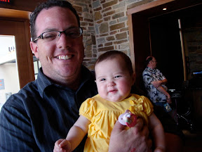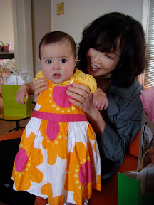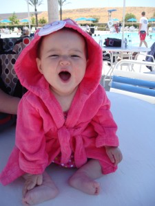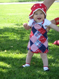Height/weight: We plopped her down on our bathroom scale the other morning and it read 16.2 lbs.! She seems to be on the petite side these days as she is still wearing 6 month size clothes. We’ll get more info at her 9 month well baby appt. coming up in August.