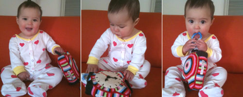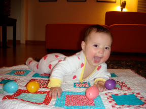 *She likes to stand up! Daddy keeps encouraging “cruising” along the couch or the bed while she stands on her feet (but I keep telling him all in good time! ha). This girl loves to stand up. Some have even said she’d probably skip the whole crawling around thing and just start walkin’. We’ll see about that. So far, it’s just too cute watching her stand on those skinny little legs while she looks so proud of herself.