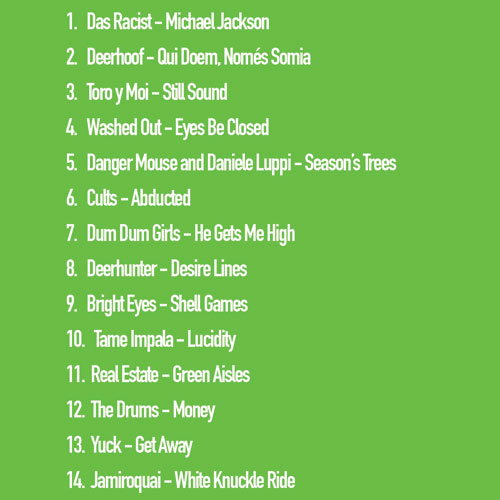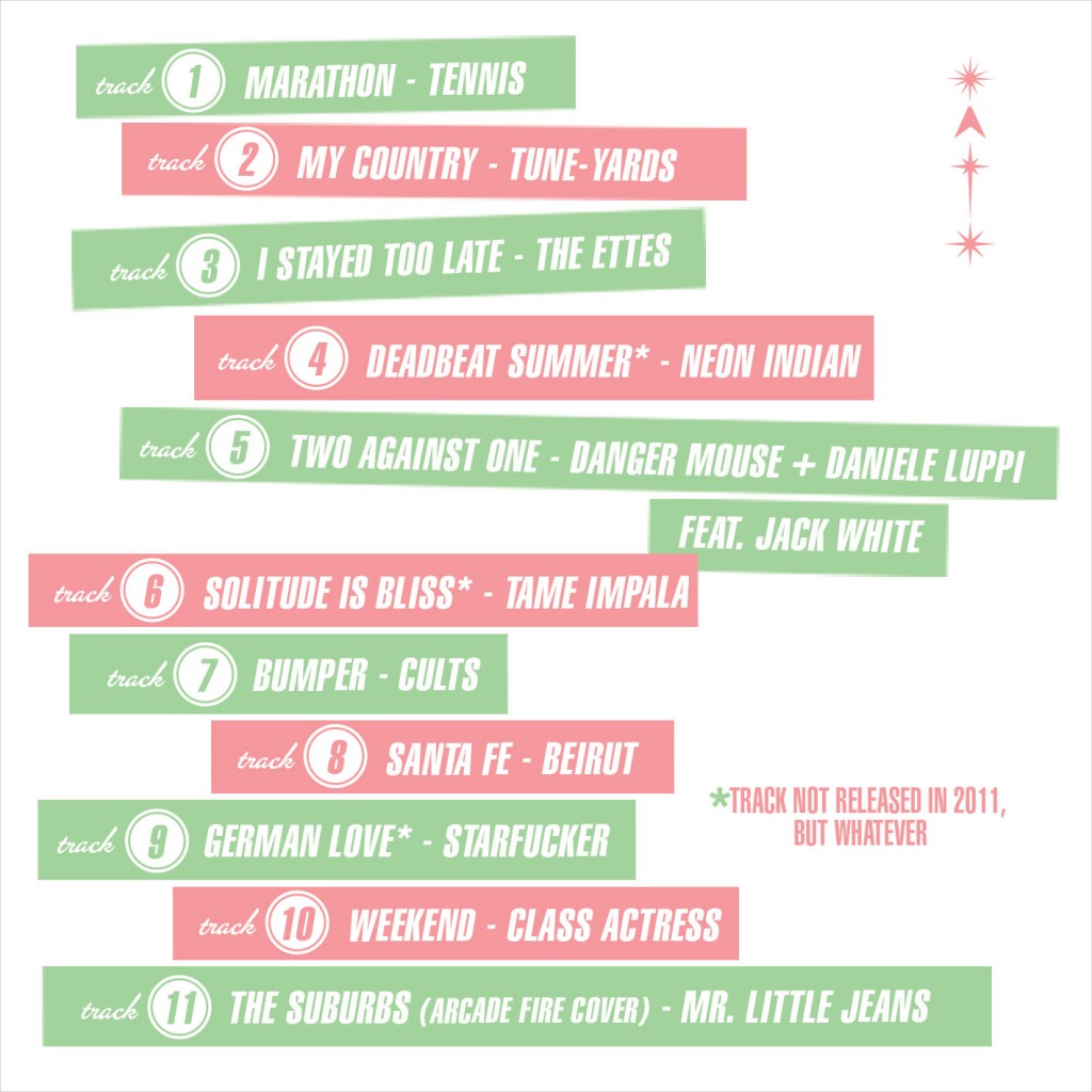 To wrap up 2010, Ed & Carrie both made music compilations. We came from very different points of view – Ed discovered a lot of new stuff he loved, and came up with a solid comp of favorites. Carrie was pretty disenchanted and bored with the whiny indie rock that was so popular this year, and after resigning herself to the fact that she couldn’t just burn the entire Arcade Fire and Broken Bells albums in one comp, she went a different direction! (Also – just wondering: What’s with every indie band having some sort of nature/animal themed name? Deerhunter, Deerhoof, Antler Motel, whatever …)